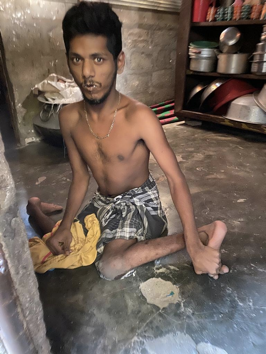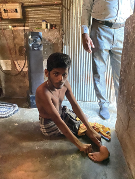 Laxshan is een 22-jarige gehandicapte jongen, die samen met zijn ouders en jongere zusje in een heel klein huisje woont. Dit ‘huis’ is deels gemaakt van steen, en deels bestaat het uit golfplaten. Toen we kwamen was het binnen enorm benauwd en warm en Laxshan zweette behoorlijk.