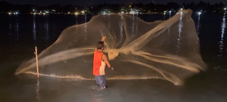 ‘s Avonds hebben we samen in een restaurant gegeten. We zijn er met tuk tuk’s heen gereden. Het restaurant lag aan het water en we zagen de vissers hun werpnet uitgooien.